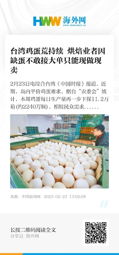 台湾的鸡蛋供应短缺危机源于多重因素,近年来,随着养殖业的发展,禽流感等疫情频繁爆发,对家禽产业造成了巨大冲击,许多养殖户因疫情压力而缩减养殖规模,导致蛋鸡数量下降,饲料价格上涨、劳动力成本增加等因素也增加了养殖户的经营压力,进一步影响了鸡蛋的产量,季节性需求增加和物流运输问题也是导致鸡蛋供应紧张的重要原因。